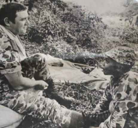 55 years ago today, Belgian Mercenary, Captain Marc Goossens of the Biafran Army and his 9-year-old Biafran orderly at the Onitsha frontline, a few hours before the Captain was killed in battle during the Second Battle of Onitsha, Nov. 27, 1968.
